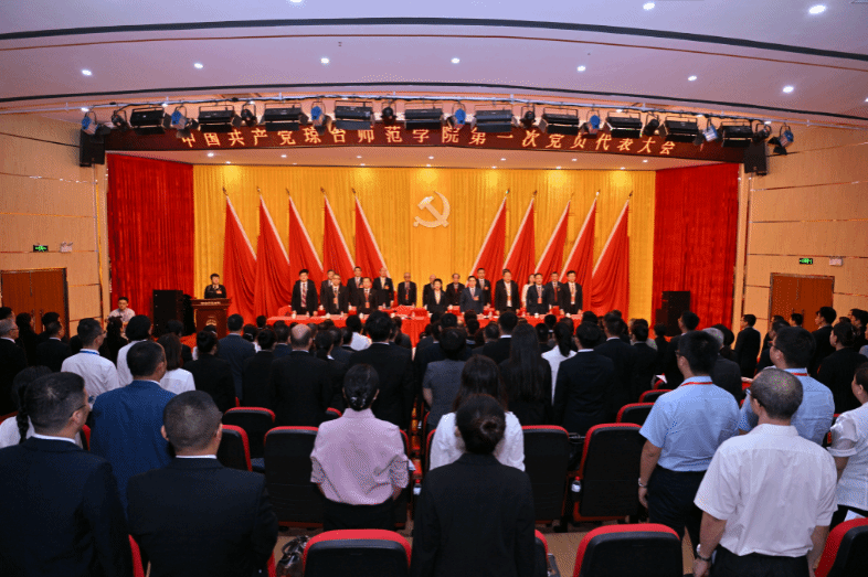 桂林洋校区图书馆报告厅的大会会场气氛庄严而热烈,主席台正上方悬挂着“中国共产党琼台师范学院第一次党员代表大会”的横幅,帷幕中央金黄色的党徽光彩夺目,十面鲜艳的红旗分列两侧。来自全校的党员代表和列席代表们肩负广大师生的重托,精神饱满,目光坚毅,步伐铿锵地步入会场,他们齐聚一堂,豪情满怀,共商学校发展大计。